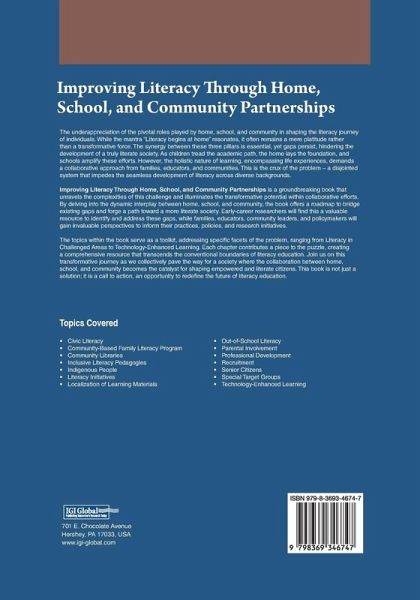The underappreciation of the pivotal roles played by home, school, and community in shaping the literacy journey of individuals. While the mantra "Literacy begins at home" resonates, it often remains a mere platitude rather than a transformative force. The synergy between these three pillars is essential, yet gaps persist, hindering the development of a truly literate society. As children tread the academic path, the home lays the foundation, and schools amplify these efforts. However, the holistic nature of learning, encompassing life experiences, demands a collaborative approach from families, educators, and communities. This is the crux of the problem - a disjointed system that impedes the seamless development of literacy across diverse backgrounds. Improving Literacy Through Home, School, and Community Partnerships is a groundbreaking book that unravels the complexities of this challenge and illuminates the transformative potential within collaborative efforts. By delving into the dynamic interplay between home, school, and community, the book offers a roadmap to bridge existing gaps and forge a path toward a more literate society. Early-career researchers will find this a valuable resource to identify and address these gaps, while families, educators, community leaders, and policymakers will gain invaluable perspectives to inform their practices, policies, and research initiatives.