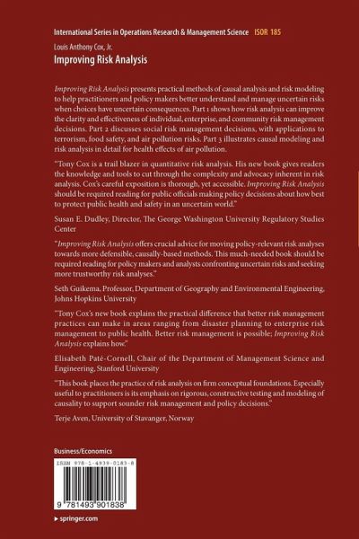 "Tony Cox's new book addresses what risk analysts and policy makers most need to know: How to find out what causes what, and how to quantify the practical differences that changes in risk management practices would make. The constructive methods in Improving Risk Analysis will be invaluable in helping practitioners to deliver more useful insights to inform high-stakes decisions and policy,in areas ranging from disaster planning to counter-terrorism investments to enterprise risk management to air pollution abatement policies. Better risk management is possible and practicable; Improving Risk Analysis explains how."