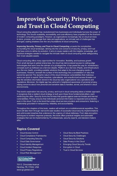 Cloud computing adoption has revolutionized how businesses and individuals harness the power of technology. The cloud's scalability, accessibility, and cost-efficiency have propelled it to the forefront of modern computing paradigms. However, as organizations increasingly rely on cloud services to store, process, and manage their data and applications, an intricate web of challenges has emerged, casting shadows over the very foundations of cloud computing. Improving Security, Privacy, and Trust in Cloud Computing unravels the complexities surrounding the cloud landscape, delving into the core concerns of security, privacy, and trust that have come to define its evolution. It aims to equip readers with the insights, knowledge, and practical strategies needed to navigate the intricate realm of cloud computing while safeguarding their most valuable assets. This book's exploration into security, privacy, and trust in cloud computing takes a holistic approach. Throughout the chapters of this book, readers will embark on a multidimensional expedition. This book will take them through real-world case studies of successful cloud security implementations and unfortunate breaches that underscore the urgency of robust defenses. From data encryption techniques to incident response protocols, this book offers practical insights and actionable strategies that can be implemented by IT professionals, security experts, and decision-makers alike.