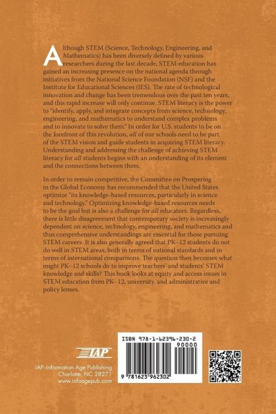 Although STEM (Science, Technology, Engineering, and Mathematics) has been diversely defined by various researchers (e.g. Buck Institute, 2003; Capraro & Slough, 2009; Scott, 2009; Wolf, 2008), during the last decade, STEM education has gained an increasing presence on the national agenda through initiatives from the National Science Foundation (NSF) and the Institute for Educational Sciences (IES). The rate of technological innovation and change has been tremendous over the past ten years, and this rapid increase will only continue. STEM literacy is the power to "identify, apply, and integrate concepts from science, technology, engineering, and mathematics to understand complex problems and to innovate to solve them" (Washington State STEM, 2011, Internet). In order for U.S. students to be on the forefront of this revolution, ALL of our schools need to be part of the STEM vision and guide students in acquiring STEM literacy. Understanding and addressing the challenge of achieving STEM literacy for ALL students begins with an understanding of its element and the connections between them. In order to remain competitive, the Committee on Prospering in the Global Economy has recommended that the US optimize "its knowledge-based resources, particularly in science and technology" (National Academies, 2007, p. 4). Optimizing knowledge-based resources needs to be the goal but is also a challenge for ALL educators (Scheurich & Huggins, 2009). Regardless, there is little disagreement that contemporary society is increasingly dependent on science, technology, engineering, and mathematics and thus comprehensive understandings are essential for those pursuing STEM careers. It is also generally agreed that PK-12 students do not do well in STEM areas, both in terms of national standards and in terms of international comparisons (Kuenzi, Matthews, & Mangan, 2006; Capraro, Capraro, Yetkiner, Corlu, Ozel, Ye, & Kim, 2011). The question then becomes what might PK-12 schools do to improve teachers' and students' STEM knowledge and skills? This book will look at equity and access issues in STEM education from PK-12, university, and administrative and policy lenses.