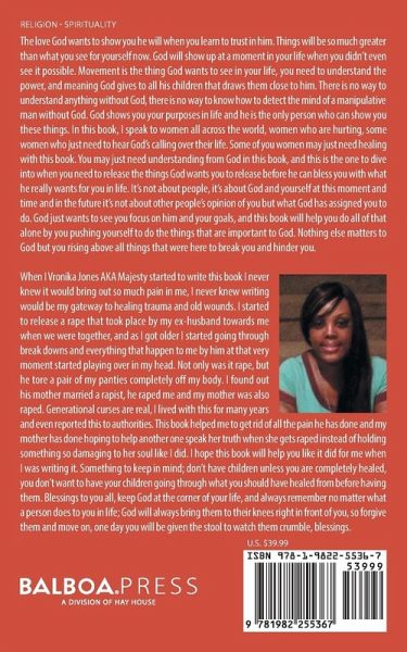 The love God wants to show you he will when you learn to trust in him. Things will be so much greater than what you see for yourself now. God will show up at a moment in your life when you didn't even see it possible. Movement is the thing God wants to see in your life, you need to understand the power, and meaning God gives to all his children that draws them close to him. There is no way to understand anything without God, there is no way to know how to detect the mind of a manipulative man without God. God shows you your purposes in life and he is the only person who can show you these things. In this book, I speak to women all across the world, women who are hurting, some women who just need to hear God's calling over their life. Some of you women may just need healing with this book. You may just need understanding from God in this book, and this is the one to dive into when you need to release the things God wants you to release before he can bless you with what he really wants for you in life. It's not about people, it's about God and yourself at this moment and time and in the future it's not about other people's opinion of you but what God has assigned you to do. God just wants to see you focus on him and your goals, and this book will help you do all of that alone by you pushing yourself to do the things that are important to God. Nothing else matters to God but you rising above all things that were here to break you and hinder you. When I Vronika Jones AKA Majesty started to write this book I never knew it would bring out so much pain in me, I never knew writing would be my gateway to healing trauma and old wounds. I started to release a rape that took place by my ex-husband towards me when we were together, and as I got older I started going through break downs and everything that happen to me by him at that very moment started playing over in my head. Not only was it rape, but he tore a pair of my panties completely off my body. I found out his mother married a rapist, he raped me and my mother was also raped. Generational curses are real, I lived with this for many years and even reported this to authorities. This book helped me to get rid of all the pain he has done and my mother has done hoping to help another one speak her truth when she gets raped instead of holding something so damaging to her soul like I did. I hope this book will help you like it did for me when I was writing it. Something to keep in mind; don't have children unless you are completely healed, you don't want to have your children going through what you should have healed from before having them. Blessings to you all, keep God at the corner of your life, and always remember no matter what a person does to you in life; God will always bring them to their knees right in front of you, so forgive them and move on, one day you will be given the stool to watch them crumble, blessings.