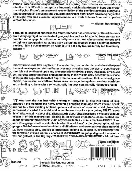 IMPROVISATIONS extends Charles Olson's projective verse into Language and Visual poetry with improvised text organized in the spirit of an extended free jazz performance.