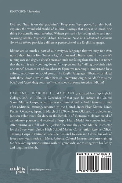 This book addresses many of the social issue’s facing young adults today. They will interact with people who don’t look like themselves, or have the same traditions, culture or orientation. Their quality of life as an adult may depend on many of the decisions they make today. In this book students will learn it’s okay to be different and to accept all people as they are. To treat all people as you would want to be treated; with dignity and respect. To do your best and be the best you can be. To be humble and kind. To be patient. To love your family and friends. To do what is right and be a good person. To keep getting up every time you’re knocked down; to not give up. That bullying and harassment are not okay. To understand that losing is part of a journey. That we gain knowledge from our loses and keep moving forward. The Marine Corps Core Values of Honor, Courage, and Commitment are presented to the reader as an example of how to conduct themselves with integrity, to do what is right, and to achieve a standard of excellence. This book uses Idioms (sayings) to provide a different perspective of the English language; words that say one thing but mean another. An example of a well know Idiom is the saying;" It’s raining cats and dogs." The saying doesn’t mean that dogs and cats are falling from the sky, but rather that it’s raining very hard. The book is divided into four chapters, the sayings in each chapter are divided into three parts. The first part list the saying, the second part explains the meaning of the saying, and the third part provides an example that is relative to everyday experiences. The third part is what differentiates this book from other books on Idioms The first chapter provides lessons learned from everyday sayings. Sayings that most adults are familiar with, but unfamiliar to most young adults. The second chapter provides sayings on how to: save money, how to spend it, how to stretch it, how to budget it, and how to compound it. Money management is one of the most important skills that must be learned to be financially stable. The third chapter provides thoughts on leadership and character. Leadership; it’s not about being the best, it’s about making other people better. Chapter three is also about; positive thinking, not fearing failure (we all have failed from time to time), being decisive, and taking a stand. Chapter four concentrates on how we interact with family members, friends, boyfriends and girlfriends, and employers. Colonel Robert E Jackson is a retired United States Marine, a Vietnam Veteran and a recipient of the Purple Heart Medal for wounds sustained in combat. Col Jackson has advanced degrees from both Springfield College, and Georgia State University.