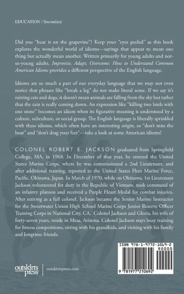 This book addresses many of the social issue’s facing young adults today. They will interact with people who don’t look like themselves, or have the same traditions, culture or orientation. Their quality of life as an adult may depend on many of the decisions they make today. In this book students will learn it’s okay to be different and to accept all people as they are. To treat all people as you would want to be treated; with dignity and respect. To do your best and be the best you can be. To be humble and kind. To be patient. To love your family and friends. To do what is right and be a good person. To keep getting up every time you’re knocked down; to not give up. That bullying and harassment are not okay. To understand that losing is part of a journey. That we gain knowledge from our loses and keep moving forward. The Marine Corps Core Values of Honor, Courage, and Commitment are presented to the reader as an example of how to conduct themselves with integrity, to do what is right, and to achieve a standard of excellence. This book uses Idioms (sayings) to provide a different perspective of the English language; words that say one thing but mean another. An example of a well know Idiom is the saying;" It’s raining cats and dogs." The saying doesn’t mean that dogs and cats are falling from the sky, but rather that it’s raining very hard. The book is divided into four chapters, the sayings in each chapter are divided into three parts. The first part list the saying, the second part explains the meaning of the saying, and the third part provides an example that is relative to everyday experiences. The third part is what differentiates this book from other books on Idioms The first chapter provides lessons learned from everyday sayings. Sayings that most adults are familiar with, but unfamiliar to most young adults. The second chapter provides sayings on how to: save money, how to spend it, how to stretch it, how to budget it, and how to compound it. Money management is one of the most important skills that must be learned to be financially stable. The third chapter provides thoughts on leadership and character. Leadership; it’s not about being the best, it’s about making other people better. Chapter three is also about; positive thinking, not fearing failure (we all have failed from time to time), being decisive, and taking a stand. Chapter four concentrates on how we interact with family members, friends, boyfriends and girlfriends, and employers. Colonel Robert E Jackson is a retired United States Marine, a Vietnam Veteran and a recipient of the Purple Heart Medal for wounds sustained in combat. Col Jackson has advanced degrees from both Springfield College, and Georgia State University.