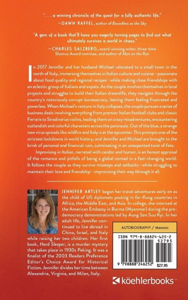 "A perfect read for the globally curious-the adventurer at heart!" -Jessica Buchanan, New York Times bestselling author of Impossible Odds ". . . a winning chronicle of the quest for a fully authentic life." -Dawn Raffel, author of Boundless as the Sky "A gem of a book that'll have you eagerly turning pages to find out what ultimately survives a world in chaos." -Charles Salzberg, award-winning writer, three-time Shamus Award nominee, and author of Man on the Run "[Artley's] story is philosophical and poignant and offers rare insight into the reality of leading an adventuresome lifestyle." -Donna Keel Armer, author of Solo in Salento: A Memoir (Italian Translation: Un'Americana in Salento) In 2017 Jennifer and her husband Michael relocated to a small town in the north of Italy, immersing themselves in Italian culture and cuisine-passionate about food quality and regional recipes-while making close friendships with an eclectic group of Italians and expats. As the couple involves themselves in local projects and struggles to build their Italian dreamlife, they navigate through the country's notoriously corrupt bureaucracy, leaving them feeling frustrated and powerless. When Michael's venture in Italy collapses, the couple pursues a series of business deals involving everything from premier Italian football clubs and classic Ferraris to Stradivarius violins, leading them on crazy misadventures, encountering outlandish and colorful characters across the peninsula. Out of the blue, a strange new virus spreads like wildfire and Italy is at the epicenter. This prompts one of the strictest lockdowns in world history, and Jennifer and Michael are brought to the brink of personal and financial ruin, culminating in an unexpected twist of fate. Improvising in Italian, narrated with candor and humor, is an honest appraisal of the romance and pitfalls of being a global nomad in a fast-changing world. It follows the couple as they survive missteps and setbacks-while struggling to maintain their love and friendship-improvising their way through it all.