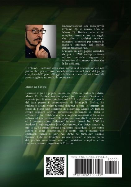Improvvisazione jazz consapevole (volume 2), il nuovo libro di Marco Di Battista, non è un semplice manuale ma un saggio che offre a qualsiasi musicista numerosi strumenti per entrare in maniera informata nel mondo dell'improvvisazione. L'autore, in 254 pagine corredate da più di 200 esempi, affianca nozioni tecniche rigorose e innovative al contesto storico che le ha prodotte. Il volume, il secondo della serie, continua il discorso avviato nel primo libro per arrivare propedeuticamente, nel corso del piano completo dell'opera, all'oggi, alla libertà di concedersi il lusso di poter scegliere attraverso la conoscenza.