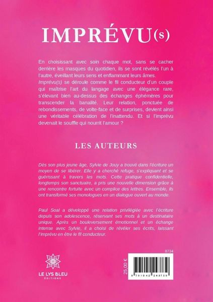 En choisissant avec soin chaque mot, sans se cacher derrière les masques du quotidien, ils se sont révélés l'un à l'autre, éveillant leurs sens et enflammant leurs âmes. Imprévu(s) se déroule comme le fil conducteur d'un couple qui maîtrise l'art du langage avec une élégance rare, s'élevant bien au-dessus des échanges éphémères pour transcender la banalité. Leur relation, ponctuée de rebondissements, de volte-face et de surprises, devient ainsi une véritable célébration de l'inattendu. Et si l'imprévu devenait le souffle qui nourrit l'amour ?