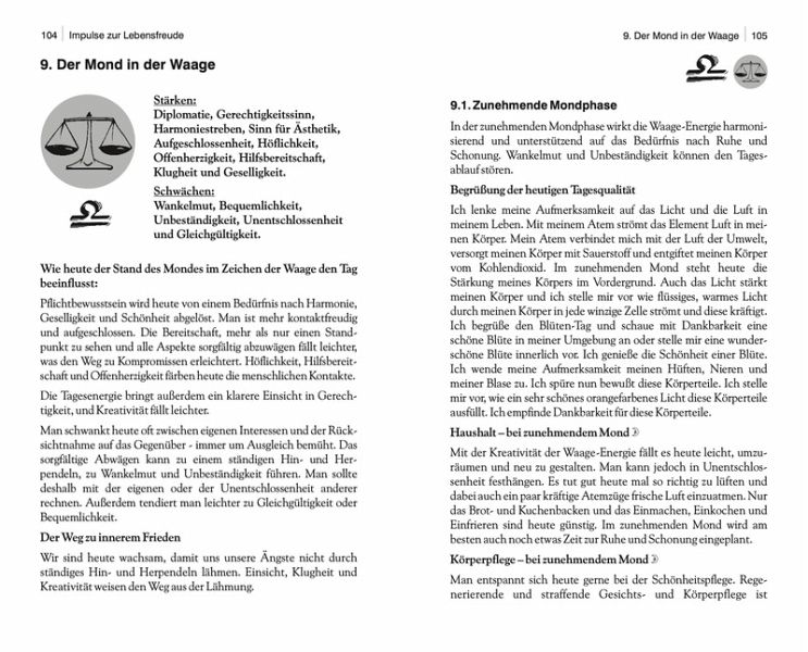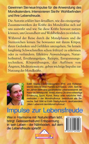 Die Autorin erklärt hier detailliert, wie das einzigartige Zusammenwirken der Kräfte des Mondzyklus sich auf uns auswirkt und wie Sie diese Kräfte bewusst nutzen können, um Gesundheit und Wohlbefinden zu stärken. Während der Reise durch die Mondphasen und die Sternzeichen lernen Sie bewusster mit ihrem Körper, ihren Gedanken und Gefühlen umzugehen; Sie lernen langfristig Schwachstellen schon früh(er) zu erkennen oder zu verhindern. Effektive Anwendungen, Naturheilmittel, Ernährungstipps, Rezepte, Entspannungstechniken, Körperübungen, das Auflösen von Ängsten, Meditationen etc. geben wichtige Impulse zur Nutzung der Mondkräfte. Erlangen Sie ein tieferes Verständnis dafür, wie zuverlässig die Beachtung der natürlichen Rhythmen unser Leben in Balance bringt und intensive Lebensfreude weckt. Wer in Harmonie mit diesen Kräften lebt, bringt Gelassenheit und Entspannung in sein Leben - der Nährboden, auf dem die Lebensfreude sprießt!
