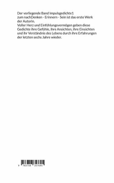 Der vorliegende Band Impulsgedichte1 zum nachDenken - Erinnern- Sein ist das erste Werk der Autorin. Voller Herz und Einfühlungsvermögen geben diese Gedichte ihre Gefühle, ihre Ansichten, ihre Einsichten und ihr Verständnis des Lebens durch die Erfahrungen der letzten sechs Jahre wieder.