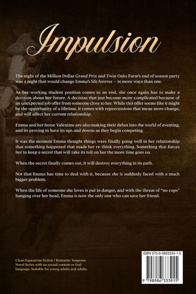 Book Two in the "Impelled" Series: The night of the Million Dollar Grand Prix and Twin Oaks Farm's end of season party was a night that would change Emma's life forever - in more ways than one. As her working student position comes to an end, she once again has to make a decision about her future. A decision that just become more complicated because of an unexpected job offer from someone close to her. While this offer seems like it might be the opportunity of a lifetime, it comes with repercussions that mean more change; one of which will affect her current relationship. Emma and her horse Valentine are also making their debut into the world of eventing, and its proving to have its ups and downs as they begin competing. However, right as Emma thinks things are finally going well in her relationship, something happens that makes her re-think everything. Something that forces her to keep a secret that will take its toll on her the more time goes on. When the secret finally comes out, it will destroy everything in its path. Not that Emma has time to deal with it, because she is suddenly faced with a much bigger problem. When the life of someone she loves is put in danger, and with the threat of "no cops" hanging over her head, Emma is now the only one who can save her friend. However, this is only the beginning of the decisions and complications life is about to throw Emma... (Clean equestrian fiction / romantic suspense series with no sexual content or foul language. Suitable for young adults and adults. This book series is intended to be read sequentially.) Editorial Review (of Book One in the Series): "A suspenseful, romantic, page-turning story about a young woman's search for success in the Florida show jumping world. Emma Walker is starting a new life. One in which she lets go of everything to begin again, everything that is, except her love of horses. Impelled is a lovely debut novel that gets the horse facts right and is difficult to put down. I look forward to reading the next book in this series" - Carly Kade, Author of the "In the Reins" Series