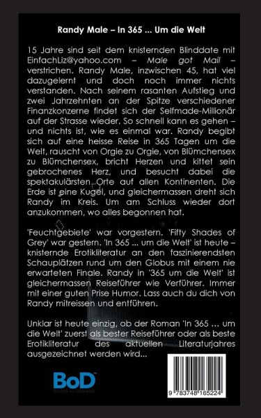 15 Jahre sind seit dem knisternden Blinddate mit EinfachLiz@yahoo.com, Male got Mail, verstrichen. Randy Male, inzwischen 45, hat viel dazugelernt und doch noch immer nichts verstanden. Nach seinem rasanten Aufstieg und zwei Jahrzehnten an der Spitze verschiedener Finanzkonzerne findet sich der Selfmade-Millionär auf der Strasse wieder. So schnell kann es gehen, und nichts ist, wie es einmal war. Randy begibt sich auf eine heisse Reise in 365 Tagen um die Welt, rauscht von Orgie zu Orgie, von Blümchensex zu Blümchensex, bricht Herzen und kittet sein gebrochenes Herz, und besucht dabei die spektakulärsten Orte auf allen Kontinenten. Die Erde ist eine Kugel, und gleichermassen dreht sich Randy im Kreis. Um am Schluss wieder dort anzukommen, wo alles begonnen hat.'Feuchtgebiete' war vorgestern. 'Fifty Shades of Grey' war gestern. 'In 365 ... um die Welt' ist heute. Knisternde Erotikliteratur an den faszinierendsten Schauplätzen rund um den Globus mit einem nie erwarteten Finale. Randy in '365 um die Welt' ist gleichermassen Reiseführer wie Verführer. Immer mit einer guten Prise Humor. Lass auch du dich von Randy mitreissen und entführen.Unklar ist heute einzig, ob der Roman 'In 365 ... um die Welt' zuerst als bester Reiseführer oder als beste Erotikliteratur des aktuellen Literaturjahres ausgezeichnet werden wird...
