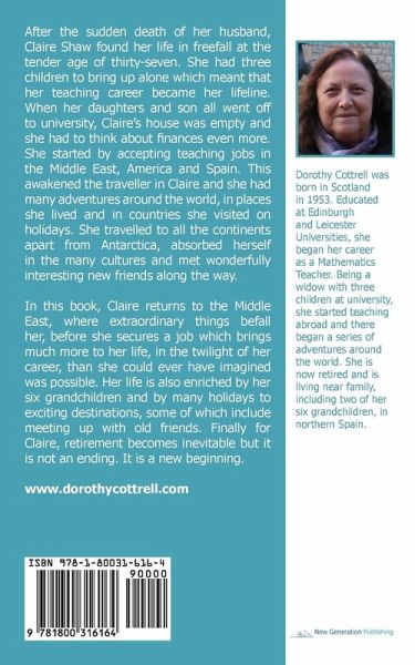 After the sudden death of her husband, Claire Shaw found her life in freefall at the tender age of thirty-seven. She had three children to bring up alone which meant that her teaching career became her lifeline. When her daughters and son all went off to university, Claire's house was empty and she had to think about finances even more. She started by accepting teaching jobs in the Middle East, America and Spain. This awakened the traveller in Claire and she had many adventures around the world, in places she lived and in countries she visited on holidays. She travelled to all the continents apart from Antarctica, absorbed herself in the many cultures and met wonderfully interesting new friends along the way. In this book, Claire returns to the Middle East, where extraordinary things befall her, before she secures a job which brings much more to her life, in the twilight of her career, than she could ever have imagined was possible. Her life is also enriched by her six grandchildren and by many holidays to exciting destinations, some of which include meeting up with old friends. Finally for Claire, retirement becomes inevitable but it is not an ending. It is a new beginning.