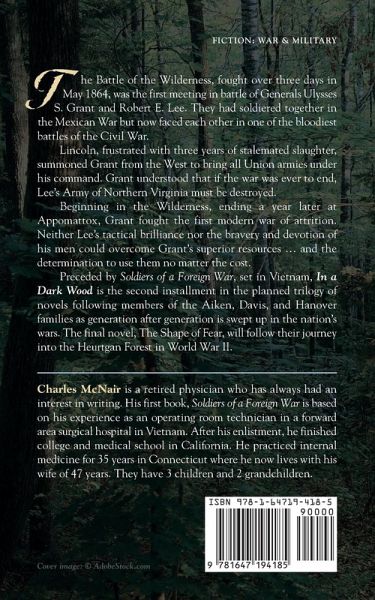 "In a Dark Wood" is a novel of the civil war battle that has come to be called "The Battle of the Wilderness." Fought in early May, 1864, it was a contest between the legendary Southern general, Robert E. Lee and the relatively unknown Union general, Ulysses S. Grant. Lincoln, frustrated by his previous generals' failures against Lee, brought Grant east after his successes along the Mississippi. Lincoln was less concerned about Grant's rumored drinking and more about his reputation as a tenacious fighter. Every other general who went up against Lee was beaten and either retreated to lick their wounds or were timid in pursuit such as Meade after Gettysburg. Lincoln hoped for more from Grant. Three Union soldiers: a cavalryman, Ben Davis, an artillerist, Joseph Hanover and a medical orderly, Mathias Aiken are swept into the battle. They oppose three Confederate soldiers: two infantry men from North Carolina, Amos Parcher and Daniel McKettrick, and a deadly sharpshooter, Jason Claiborne armed with the lethal Whitworth rifle. The vital roles played by the arms carried into this battle and their effects explain how a battle and a war can turn on the difference between the Union Sharps and Spencer rifles versus the Confederate Enfield rifle. This was not a battle of valiant soldiers, arrayed in stirring formations stepping off into glory. This was an infantryman's fight: man against man, fought in impenetrable woods, obscured by smoke, the soldiers rarely seeing their enemy but rather firing blindly towards flame and noise. The woods were covered with the dry leaf fall and tangled thickets. The dead and wounded fell unnoticed amongst the vegetation and the bones of Hooker's Union army lost at Chancellorsville on some of the same ground the year before. Fires, easily ignited by the gunfire, consumed without favor, the fallen Union and Confederate soldiers. The battle would cost a total of 29,000 of them in less than three days. ¿ In the midst of this carnage, love grew between a beautiful Union nurse, Braith Glyn and the medical orderly, Mathias Aiken, clinging to each other for their very lives. Amos Parcher's sister, Sally, nursed the wounded Daniel McKettrick back to health after his wounding and into a life together after the war. The Civil War was the first modern, total war. Grant understood what a war of attrition meant and how to fight it. Ignoring the politicians' cries of "On to Richmond", Grant made Lee's Army of Northern Virginia his target. The Battle of the Wilderness was his opening thrust at the heart of that army, which would be finally killed a year later at Appomattox.