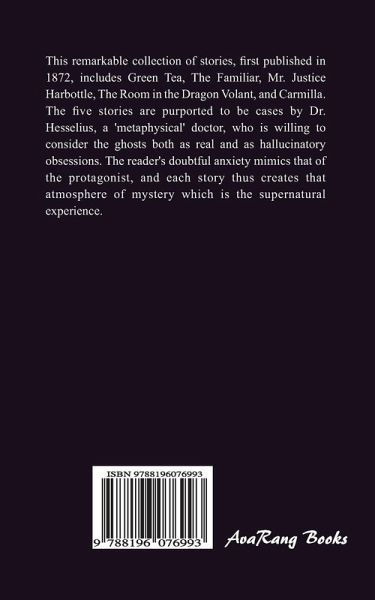 This remarkable collection of stories, first published in 1872, includes Green Tea, The Familiar, Mr. Justice Harbottle, The Room in the Dragon Volant, and Carmilla. The five stories are purported to be cases by Dr. Hesselius, a 'metaphysical' doctor, who is willing to consider the ghosts both as real and as hallucinatory obsessions. The reader's doubtful anxiety mimics that of the protagonist, and each story thus creates that atmosphere of mystery which is the supernatural experience.