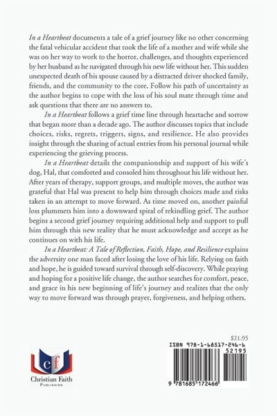 In a Heartbeat documents a tale of a grief journey like no other concerning the fatal vehicular accident that took the life of a mother and wife while she was on her way to work to the horror, challenges, and thoughts experienced by her husband as he navigated through his new life without her. This sudden unexpected death of his spouse caused by a distracted driver shocked family, friends, and the community to the core. Follow his path of uncertainty as the author begins to cope with the loss of his soul mate through time and ask questions that there are no answers to. In a Heartbeat follows a grief time line through heartache and sorrow that began more than a decade ago. The author discusses topics that include choices, risks, regrets, triggers, signs, and resilience. He also provides insight through the sharing of actual entries from his personal journal while experiencing the grieving process. In a Heartbeat details the companionship and support of his wife's dog, Hal, that comforted and consoled him throughout his life without her. After years of therapy, support groups, and multiple moves, the author was grateful that Hal was present to help him through choices made and risks taken in an attempt to move forward. As time moved on, another painful loss plummets him into a downward spiral of rekindling grief. The author begins a second grief journey requiring additional help and support to pull him through this new reality that he must acknowledge and accept as he continues on with his life. In a Heartbeat: A Tale of Reflection, Faith, Hope, and Resilience explains the adversity one man faced after losing the love of his life. Relying on faith and hope, he is guided toward survival through self-discovery. While praying and hoping for a positive life change, the author searches for comfort, peace, and grace in his new beginning of life's journey and realizes that the only way to move forward was through prayer, forgiveness, and helping others.