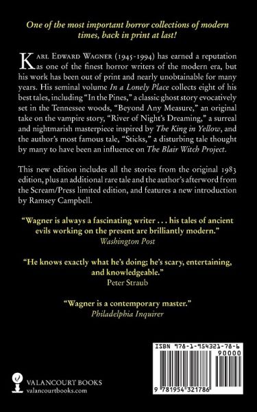 One of the most important horror collections of modern times, back in print at last! Karl Edward Wagner (1945-1994) has earned a reputation as one of the finest horror writers of the modern era, but his work has been out of print and nearly unobtainable for many years. His seminal volume In a Lonely Place collects eight of his best tales, including "In the Pines," a classic ghost story evocatively set in the Tennessee woods, "Beyond Any Measure," an original take on the vampire story, "River of Night's Dreaming," a surreal and nightmarish masterpiece inspired by The King in Yellow, and the author's most famous tale, "Sticks," a disturbing story thought by many to have been the basis for The Blair Witch Project. This new edition includes all the stories from the original 1983 edition, plus an additional rare tale and the author's afterword from the Scream/Press limited edition, and features a new introduction by Ramsey Campbell. "Wagner is always a fascinating writer ... his tales of ancient evils working on the present are brilliantly modern." - Washington Post "He knows exactly what he's doing; he's scary, entertaining, and knowledgeable." - Peter Straub "Wagner is a contemporary master." - Philadelphia Inquirer