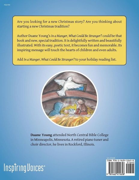 Are you looking for a new Christmas story? Are you thinking about starting a new Christmas tradition? Author Duane Young'sIn a Manger, What Could Be Stranger? could be that book and new, special tradition. It is delightfully written and beautifully illustrated. With its easy, poetic text, it becomes fun and memorable. Its inspiring message will touch the hearts of children and even adults. Add In a Manger, What Could Be Stranger? to your holiday reading list.