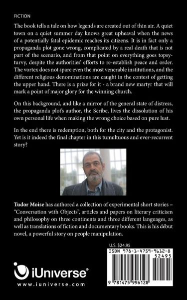 The book tells a tale on how legends are created out of thin air. A quiet town on a quiet summer day knows great upheaval when the news of a potentially fatal epidemic reaches its citizens. It is in fact only a propaganda plot gone wrong, complicated by a real death that is not part of the scenario, and from that point on everything goes topsy-turvy, despite the authorities' efforts to re-establish peace and order. The vortex does not spare even the most venerable institutions, and the different religious denominations are caught in the contest of getting the upper hand. There is a prize for it - a brand new martyr that will mark a point of major glory for the winning church. On this background, and like a mirror of the general state of distress, the propaganda plot's author, the Scribe, lives the dissolution of his own personal life when making the wrong choice based on pure lust. In the end there is redemption, both for the city and the protagonist. Yet is it indeed the final chapter in this tumultuous and ever-recurrent story?