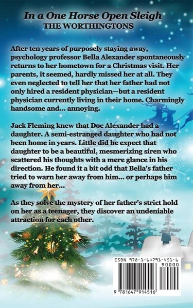 Get swept up into a whirlwind, charming romance bursting at the seams with the magic of Christmas. After ten years of purposely staying away, psychology professor Bella Alexander spontaneously returns to her hometown for a Christmas visit. Her parents, it seemed, hardly missed her at all. They even neglected to tell her that her father had not only hired a resident physician-but a resident physician currently living in their home. Charmingly handsome and... annoying. Jack Fleming knew that Doc Alexander had a daughter. A semi-estranged daughter who had not been home in years. Little did he expect that daughter to be a beautiful, mesmerizing siren who scattered his thoughts with a mere glance in his direction. He found it a bit odd that Bella's father tried to warn her away from him... or perhaps him away from her... As they solve the mystery of her father's strict hold on her as a teenager, they discover an undeniable attraction for each other. For a sparkling, snowy world of unexpected Christmas romance, family togetherness, and small-town wonder found only at Christmastime, plus the shimmering magic of love-at-first sight, read A One Horse Open Sleigh!