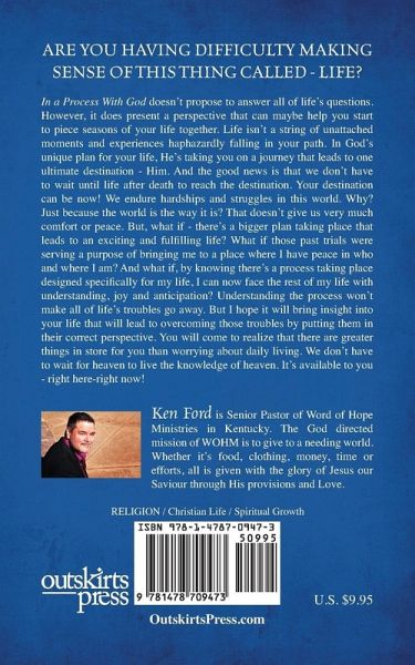 ARE YOU HAVING DIFFICULTY MAKING SENSE OF THIS THING CALLED - LIFE? In a Process With God doesn't propose to answer all of life's questions. However, it does present a perspective that can maybe help you start to piece seasons of your life together. Life isn't a string of unattached moments and experiences haphazardly falling in your path. In God's unique plan for your life, He's taking you on a journey that leads to one ultimate destination - Him. And the good news is that we don't have to wait until life after death to reach the destination. Your destination can be now! We endure hardships and struggles in this world. Why? Just because the world is the way it is? That doesn't give us very much comfort or peace. But, what if - there's a bigger plan taking place that leads to an exciting and fulfilling life? What if those past trials were serving a purpose of bringing me to a place where I have peace in who and where I am? And what if, by knowing there's a process taking place designed specifically for my life, I can now face the rest of my life with understanding, joy and anticipation? Understanding the process won't make all of life's troubles go away. But I hope it will bring insight into your life that will lead to overcoming those troubles by putting them in their correct perspective. You will come to realize that there are greater things in store for you than worrying about daily living. We don't have to wait for heaven to live the knowledge of heaven. It's available to you - right here-right now! Ken Ford is Senior Pastor of Word of Hope Ministries in Kentucky. The God directed mission of WOHM is to give to a needing world. Whether it's food, clothing, money, time or efforts, all is given with the glory of Jesus our Saviour through His provisions and Love.