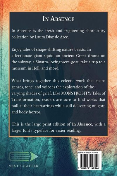 In Absence is the fresh and frightening short story collection by Laura Diaz de Arce. Enjoy tales of shape-shifting nature beasts, an affectionate giant squid, an ancient Greek drama on the subway, a Sinatra-loving were-goat, take a trip to a museum in Hell, and more. What brings together this eclectic work that spans genres, tone, and voice is the exploration of the varying shades of grief. Like MONSTROSITY: Tales of Transformation, readers are sure to find works that pull at their heartstrings while still delivering on gore and body horror. This is the large print edition of In Absence, with a larger font / typeface for easier reading.