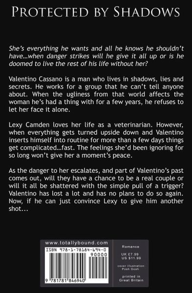 She's everything he wants and all he knows he shouldn't have...when danger strikes will he give it all up or is he doomed to live the rest of his life without her? Valentino Cassano is a man who lives in shadows, lies and secrets. He works for a group that he can't tell anyone about. When the ugliness from that world affects the woman he's had a thing with for a few years, he refuses to let her face it alone. Lexy Camden loves her life as a veterinarian. However when everything gets turned upside down and Valentino inserts himself into routine for more than a few days things get complicated...fast. The feelings she'd been ignoring for so long won't give her a moment's peace. As the danger to her escalates, and part of Valentino's past comes out, will they have a chance to be a real couple or will it all be shattered with the simple pull of a trigger? Valentino has lost a lot and has no plans to do so again, now if he can just convince Lexy to give him another shot.