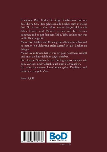 In meinem Buch finden Sie einige Geschichten rund um das Thema Sex. Hier geht es in alle Löcher, auch in meine. Frauen und Männer werden auf ihre Kosten kommen und es gibt fast kein Tabu. Meine Freundinnen haben mir ein paar Sexstories erzählt und auch die habe ich hier aufgeschrieben.Für einsame Stunden ist das Buch genauso geeignet wie zum Vorlesen und vielleicht auch zum Nachmachen.Ich wünsche meinen Leser_innen ein geiles Kopfkino und natürlich eine geile Zeit.