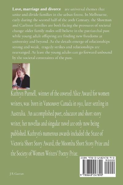 Love, marriage and divorce are universal themes that unite and divide families in the urban forest. In Melbourne, early during the second half of the 20th Century, the Shorman and Carlister families are both facing the pressures of societal change: older family males still believe in the patriarchal past while young adult offspring are finding new freedoms at university and beyond. As the details emerge of relationships strong and weak, tragedy strikes and relationships are rearranged. At least the young adults can go forward unbound by the societal constraints of the past.