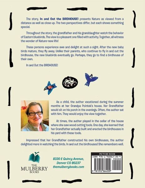 IN AND OUT THE BIRDHOUSE! The Story, In and Out the Birdhouse! presents Nature as viewed from a distance as well as close up. The two perspectives differ, but each shows something special. Throughout the story, the grandfather and his granddaughter watch the behavior of Eastern bluebirds. The view is a pleasant one filled with activity. Together, all witness the wonder of Nature-new life! These persons experience awe and delight at such a sight. After the new baby birds mature, they fly away. Unlike their parents, who continue to fly in and out the birdhouse, the new bluebirds eventually go. Perhaps, they go to find a birdhouse of their own. In and out of the birdhouse!
