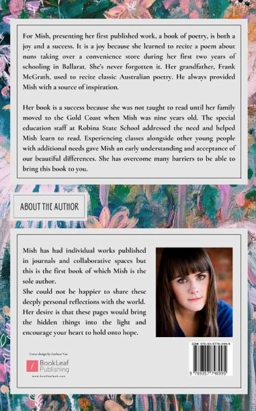 ""For Mish, presenting her first published work, a book of poetry, is both a joy and a success. It is a joy because she learned to recite a poem about nuns taking over a convenience store during her first two years of schooling in Ballarat. She's never forgotten it. Her grandfather, Frank McGrath, used to recite classic Australian poetry. He always provided Mish with a source of inspiration. Her book is a success because she was not taught to read until her family moved to the Gold Coast when Mish was nine years old. The special education staff at Robina State School addressed the need and helped Mish learn to read. Experiencing classes alongside other young people with additional needs gave Mish an early understanding and acceptance of our beautiful differences. She has overcome many barriers to be able to bring this book to you.""