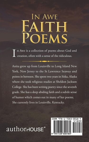 Anita grew up from Louisville to Long Island New York, New Jersey to the St Lawrence Seaway and points in between. She spent two years in Sitka, Alaska where she took religious studies at Sheldon Jackson College. She has been writing poetry since the seventh grade. She has a deep abiding faith and a subtle sense of humor which comes out in many of her poems. She currently lives in Louisville, Kentucky.
