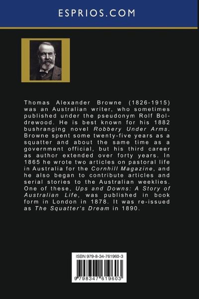 Thomas Alexander Browne (1826-1915) was an Australian writer, who sometimes published under the pseudonym Rolf Boldrewood. He is best known for his 1882 bushranging novel Robbery Under Arms. Browne spent some twenty-five years as a squatter and about the same time as a government official, but his third career as author extended over forty years. In 1865 he wrote two articles on pastoral life in Australia for the Cornhill Magazine, and he also began to contribute articles and serial stories to the Australian. One of these, Ups and Downs: A Story of Australian Life, was published in book form in London in 1878. It was re-issued as The Squatter's Dream in 1890.