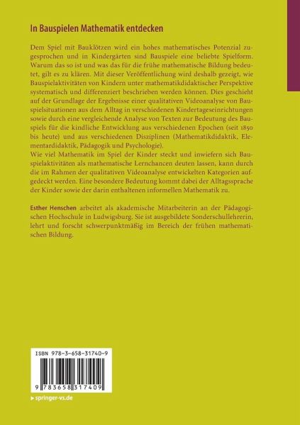 Dem Spiel mit Bauklötzen wird ein hohes mathematisches Potenzial zugesprochen und in Kindergärten sind Bauspiele eine beliebte Spielform. Warum das so ist und was das für die frühe mathematische Bildung bedeutet, gilt es zu klären. Mit dieser Veröffentlichung wird deshalb gezeigt, wie Bauspielaktivitäten von Kindern unter mathematikdidaktischer Perspektive systematisch und differenziert beschrieben werden können. Dies geschieht auf der Grundlage der Ergebnisse einer qualitativen Videoanalyse von Bauspielsituationen aus dem Alltag in verschiedenen Kindertageseinrichtungen sowie durch eine vergleichende Analyse von Texten zur Bedeutung des Bauspiels für die kindliche Entwicklung aus verschiedenen Epochen (seit 1850 bis heute) und aus verschiedenen Disziplinen (Mathematikdidaktik, Elementardidaktik, Pädagogik und Psychologie).