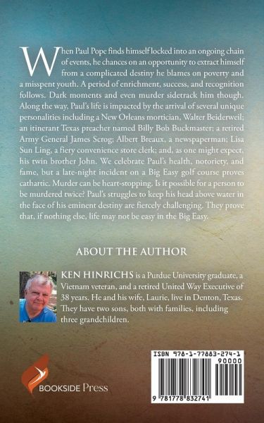 When Paul Pope finds himself locked into an ongoing chain of events, he chances on an opportunity to extract himself from a complicated destiny he blames on poverty and a misspent youth. A period of enrichment, success, and recognition follows. Dark moments and even murder sidetrack him though. Along the way, Paul's life is impacted by the arrival of several unique personalities including a New Orleans mortician, Walter Beiderweil; an itinerant Texas preacher named Billy Bob Buckmaster; a retired Army General James Scrog; Albert Breaux, a newspaperman; Lisa Sun Ling, a fiery convenience store clerk; and, as one might expect, his twin brother John. We celebrate Paul's health, notoriety, and fame, but a late-night incident on a Big Easy golf course proves cathartic. Murder can be heart-stopping. Is it possible for a person to be murdered twice? Paul's struggles to keep his head above water in the face of his eminent destiny are fiercely challenging. They prove that, if nothing else, life may not be easy in the Big Easy.