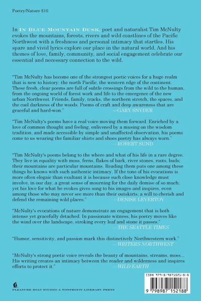 In Blue Mountain Dusk is one of those rarest of books of poetry, containing poems that ought to have been written, rather than poems that merely could have. McNulty is a careful poet, and the pieces in this book are the hard, clean nuggets left in the gold pan after washing and washing over and over. The love poems alone are worth the read, tender, and subtly erotic. As an observer of the natural world, this poet rates right up there with the best of the Chinese poets, or Robinson Jeffers in our own country. This is an honest poet, and these are honest poems.