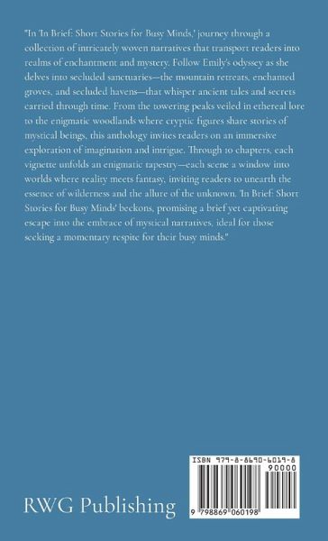 "In 'In Brief: Short Stories for Busy Minds,' journey through a collection of intricately woven narratives that transport readers into realms of enchantment and mystery. Follow Emily's odyssey as she delves into secluded sanctuaries-the mountain retreats, enchanted groves, and secluded havens-that whisper ancient tales and secrets carried through time. From the towering peaks veiled in ethereal lore to the enigmatic woodlands where cryptic figures share stories of mystical beings, this anthology invites readers on an immersive exploration of imagination and intrigue. Through 10 chapters, each vignette unfolds an enigmatic tapestry-each scene a window into worlds where reality meets fantasy, inviting readers to unearth the essence of wilderness and the allure of the unknown. 'In Brief: Short Stories for Busy Minds' beckons, promising a brief yet captivating escape into the embrace of mystical narratives, ideal for those seeking a momentary respite for their busy minds."