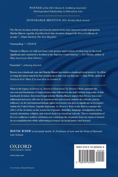 What is the legacy of Brown vs. Board of Education? While it is well known for establishing racial equality as a central commitment of American schools, the case also inspired social movements for equality in education across all lines of difference, including language, gender, disability, immigration status, socio-economic status, religion, and sexual orientation. Yet more than a half century after Brown, American schools are more racially separated than before, and educators, parents and policy makers still debate whether the ruling requires all-inclusive classrooms in terms of race, gender, disability, and other differences. In Brown's Wake examines the reverberations of Brown in American schools, including efforts to promote equal opportunities for all kinds of students. School choice, once a strategy for avoiding Brown, has emerged as a tool to promote integration and opportunities, even as charter schools and private school voucher programs enable new forms of self-separation by language, gender, disability, and ethnicity. Martha Minow, Dean of Harvard Law School, argues that the criteria placed on such initiatives carry serious consequences for both the character of American education and civil society itself. Although the original promise of Brown remains more symbolic than effective, Minow demonstrates the power of its vision in the struggles for equal education regardless of students' social identity, not only in the United States but also in many countries around the world. Further, she urges renewed commitment to the project of social integration even while acknowledging the complex obstacles that must be overcome. An elegant and concise overview of Brown and its aftermath, In Brown's Wake explores the broad-ranging and often surprising impact of one of the century's most important Supreme Court decisions.