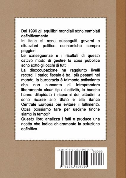 Lo Stato italiano è fallito. I governi succedutisi negli ultimi vent'anni sono stati capaci solo di aumentare le tasse e vessare i cittadini con una burocrazia asfissiante che ha reso proibitiva qualsiasi iniziativa imprenditoriale. Ormai si lavora solo per mantenere chi sta aggrappato alla poltrona e se ne infischia della situazione di indigenza di chi lotta, ogni mese, con bollette e scadenze. Diciamo basta a tutto questo, nel libro c'è l'analisi della situazione e la ricetta per cambiare tutto definitivamente. Non diventiamo un paese del quarto mondo, ce la possiamo fare!
