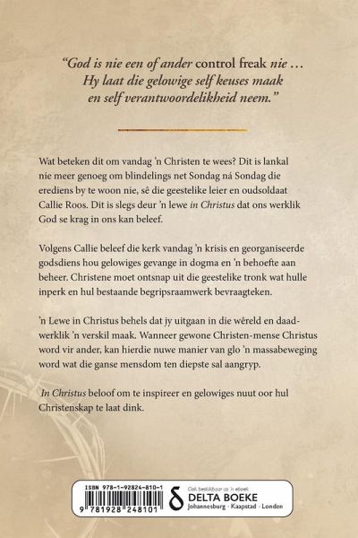 "God is nie een of ander control freak nie … Hy laat die gelowige self keuses maak en self verantwoordelikheid neem." Wat beteken dit om vandag ’n Christen to wees? Dit is lankal nie meer genoeg om blindelings net Sondag ná Sondag die erediens by te woon nie, sê die geestelike leier and oudsoldaat Callie Roos. Dit is slegs deur ’n lewe in Christus da tons werklik God se krag in ons kan beleef. Volgens Callie beleef die kerk vandag ’n krisis en georganiseerde godsdiens hou gelowiges gevange in dogma en ’n behoefte aan beheer. Christene moet onstnap uit die geestelike tronk wat hulle inperk en hul bestaande begripsraamwerk bevraagteken. ’n Lewe in Christus behels dat jy uitgaan in die wêreld en daadwerklik ’n verskil maak. Wanneer gewone Christen-mense Christus word vir ander, kan hierdie nuwe manier van glo ’n massabeweging word wat die ganse mensdom ten diepste sal aangryp. In Christus beloof om te inspireer en gelowiges nuut oor hul Christenskap te laat dink.