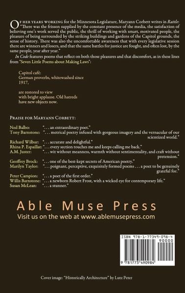 In Code was born out of Maryann Corbett’s years of work for the Minnesota Legislature, with a nonpartisan office that mandated that she maintain a public silence about politics. In poems that go from elegiac to fiery to funny, she examines behind-the-scenes legislative labor and the people who do it, the tensions of working for government in a climate hostile to government, and the buildings and grounds that put a beautiful face on a history full of ambiguities. This well-honed collection, Corbett's fifth, reflects on doublespeak and public poses; on coworkers and commutes; on legalese, courts, and elections; on news and history; and at last on retirement—through poems masterfully deployed in a dazzling array of forms: including the prose poem, the sonnet, the ghazal, the villanelle, and the canzone. Maryann Corbett is a candid, wistful, purposeful, and meditative poet in command of her craft. Of her years working for the Minnesota Legislature, Maryann Corbett writes in Rattle: "There was the frisson supplied by the constant presence of the media, the satisfaction of believing one's work served the public, the thrill of working with smart, motivated people, the pleasure of being surrounded by the striking buildings and gardens of the Capitol grounds, the sense of history. There was also the uncomfortable awareness that with every legislative session there are winners and losers, and that the same battles for justice are fought, and often lost, by the same people, year after year." In Code features poems that reflect on both those pleasures and that discomfort, as in these lines from "Seven Little Poems about Making Laws": Capitol café: German proverbs, whitewashed since 1917, are restored to view with bright applause. Old hatreds have new objects now. PRAISE FOR MARYANN CORBETT: Ned Balbo: . . . an extraordinary poet. Tony Barnstone: . . . metrical poetry infused with gorgeous imagery and the vernacular of our scientized world. Richard Wilbur: . . . accurate and delightful. Rhina P. Espaillat: . . . every section touches me and keeps calling me back. A.M. Juster: . . . wit without meanness, warmth without sentimentality, and craft without pretension. Geoffrey Brock: . . . one of the best-kept secrets of American poetry. Marilyn Taylor: . . . poignant, perceptive, exquisitely formed poems . . . a poet to be genuinely grateful for. Peter Campion: . . . a poet of the first order. Willis Barnstone: . . . a newborn Robert Frost, with a wicked eye for contemporary life. Susan McLean: . . . a stunner. ABOUT THE AUTHOR: Maryann Corbett earned a doctorate in English in 1981, with a specialization in medieval literature and linguistics. She expected to be teaching Beowulf and Chaucer and the history of the English language. Instead, she spent almost thirty-five years working for the Minnesota Legislature, helping attorneys to write in plain English and coordinating the creation of finding aids for the law. She is the author of five books of poetry and is a past winner of the Richard Wilbur Award and the Willis Barnstone Translation Prize. Her work is widely published in journals on both sides of the Atlantic and is included in anthologies like Measure for Measure: An Anthology of Poetic Meters and The Best American Poetry 2018.