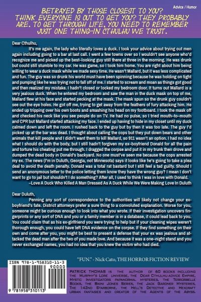 Betrayed by those closest to you? Think everyone is out to get you? They probably are. To get through life, you need to remember just one thing-In Cthulhu We Trust. Dear Cthulhu, It's me again, the lady who literally loves a duck. I took your advice about trying out men again including going to a bar at last call. I went a few towns over so I wouldn't see anyone who'd recognize me and picked up the best-looking guy still there at three in the morning. He was drunk but could still stumble to my car. He was game, so I took him home. You are right about him being willing to wear a duck mask while we made sexy time. He wasn't Mallard, but it was less complicated and fun. The guy was so drunk his world must have been spinning because he was holding on tight and pumping like he was trying not to fall off of me. I started to scream and moan as things got good and then realized my mistake. I hadn't closed or locked my bedroom door. It turns out Mallard is a very jealous duck. When he entered my bedroom and saw the man in the duck mask on top of me, Mallard flew at his face and started pecking at the mask. The mask spun so the drunk guy couldn't see out the eye holes. He got off me, trying to get away from the feathers of fury attacking him. He ended up tripping over his own boots and smashing his head on my footboard. I took the mask off and checked his neck like you see people do on TV. He had no pulse, so I tried mouth-to-mouth and CPR but Mallard started attacking my face. I ended up having to hide in my closet until my duck calmed down and left the room. I rushed back to the guy but by then it was too late. The guy I'd picked up at the bar was dead. I thought about calling the cops but they put down bears and other animals that kill people and I didn't want them to kill Mallard, so 911 wasn't an option. I had no idea what I should do with the body, but I still hadn't forgiven my ex-boyfriend Donald for all the pain and torture his cheating put me through. I dragged the corpse and put it in my trunk then drove and dumped the dead body in Donald's backyard. No one must've seen me because the cops arrested my ex. The news (I'm in Duluth, Georgia, not Minnesota) says it looks like he's going to take a plea deal to avoid the death penalty. Donald was a total rat bastard but I still feel a tad guilty. Should I send an anonymous letter to the police letting them know they have the wrong guy? I mean I don't want to go to jail but shouldn't I do something? After all, I used to think I was in love with Donald. -Love A Duck Who Killed A Man Dressed As A Duck While We Were Making Love In Duluth Dear Duluth, Penning any sort of correspondence to the authorities will likely not change your ex-boyfriend's fate. District attorneys prefer a sure thing to a convoluted explanation. Worse for you, someone might be curious enough to look into what you wrote. If their investigation uncovers fingerprints or any sort of DNA and you or a family member is in a database, it could lead back to you. You could claim that as his ex-girlfriend you were trying to help but if your cleaning wipes weren't thorough enough, you could have left DNA evidence on the corpse. If they find something on their own and come after you, you might be best to present a defense that your ex was jealous and attacked the dead man after the two of you made love. And because it was a one-night stand and you never exchanged names, you had no idea that you knew the victim who had died.