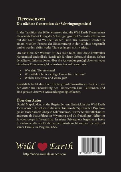 In der Tradition der Blütenessenzen sind die Wild Earth Tieressenzen die neueste Entwicklung der Schwingungsmittel. Sie unterstützen uns mit der Kraft und Weisheit wilder Tiere. Die Essenzen werden in einem rituellen Prozess der Einstimmung in der Wildnis hergestellt und es werden dafür weder Tiere gefangen noch verletzt."In das Herz der Wildnis" ist das erste Buch über diese kraftvollen Naturmittel und soll als Handbuch für ihren Gebrauch dienen. Neben detaillierten Informationen über die Anwendungsmöglichkeiten jeder einzelnen Tieressenz gibt es Antworten auf Fragen wie: Was sind Tieressenzen? Wie wähle ich die richtige Essenz für mich aus? Welche Essenzen sind wann gut?Zusätzlich bietet das Buch Hintergrundinformationen darüber, wie der Autor zur Entwicklung der Tieressenzen kam, Fallstudien und eine genaue Liste von Anwendungsmöglichkeiten.