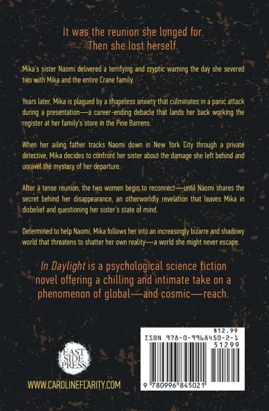 "Invites readers to solve a tantalizing riddle." - Publishers Weekly/BookLife Editor's Pick In Daylight is a sci-fi psychological thriller offering a chilling and intimate take on a phenomenon of global-and cosmic-reach. It was the reunion she longed for. Then she lost herself. Mika's sister Naomi delivered a terrifying and cryptic warning the day she severed ties with Mika and the entire Crane family. Years later, Mika is plagued by a shapeless anxiety that culminates in a panic attack during a presentation. This career-ending debacle lands her back working the register at her family's store in the Pine Barrens. When her ailing father tracks Naomi down in New York City, Mika decides to confront her sister about the damage she left behind and unravel the mystery of her departure. After a tense reunion, the two women reconnect-until Naomi shares the secret behind her disappearance, an otherworldly revelation that leaves Mika questioning her sister's state of mind. Determined to help Naomi, Mika follows her into an increasingly bizarre and shadowy world that threatens to shatter her own reality-a world she might never escape.
