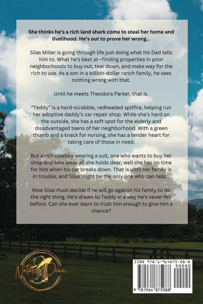She thinks he's a rich land shark come to steal her home and livelihood. He's out to prove her wrong... Silas Miller is going through life just doing what his Dad tells him to. What he's best at-finding properties in poor neighborhoods to buy out, tear down, and make way for the rich to use. As a son in a billion-dollar ranch family, he sees nothing wrong with that. Until he meets Theodora Parker, that is. "Teddy" is a hard-scrabble, redheaded spitfire, helping run her adoptive daddy's car repair shop. While she's hard on the outside, she has a soft spot for the elderly and disadvantaged teens of her neighborhood. With a green thumb and a knack for nursing, she has a tender heart for taking care of those in need. But a rich cowboy wearing a suit, one who wants to buy her shop and take away all she holds dear, well she has no time for him when his car breaks down. That is until her family is in trouble, and Silas might be the only one who can help... Now Silas must decide if he will go against his family to do the right thing. He's drawn to Teddy in a way he's never felt before. Can she ever learn to trust him enough to give him a chance?