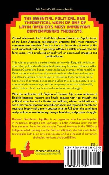 The essential political and theoretical work of one of Latin America's most important contemporary theorists.Raquel Gutiéeacute;rrez Aguilar is one of the foremost Latin American political thinkers. From armed Indigenous struggle in the Bolivian altiplano to the contemporary wave of feminist uprisings, Raquel Gutiérrez's life and work have spanned and spurred on some of the most important political sequences in the last forty years in Latin America. Almost unknown in the United States, Raquel is one of the Latin American anticapitalist, antistate Left's most important contemporary theorists. She has produced important work on communal struggles and political forms and has been at the center of some of the most important political organizing in Bolivia and Mexico in the last forty years. This volume presents an extensive interview with Raquel in which she charts her political and intellectual trajectory from her militancy in the Ejército Guerrillero Tupac-Katari, to Bolivia's famous Water and Gas wars, to the massive wave of popular feminist rebellions and organizing. Translator and writer, Brian Whitner offers two essays in translation that contain some of her central theoretical concepts, including the veto and reappropriation of communal wealth, for thinking a politics in common, and of the commons.With the publication of In Defense of Common Life, a new audience of English-language readers can finally engage with the thought and political experience of a thinker and militant, whose contributions to social movements span an incredible political and regional breadth, and resonate deeply with current debates with the US about the conditions and practices of revolutionary change, feminism, and popular struggle.