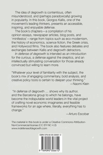 Buy the book directly from the publisher at www.indefenseofdegrowth.com The idea of degrowth is contentious, often misunderstood, and (perhaps paradoxically) growing in popularity. In this book, Giorgos Kallis, one of the movement's leading thinkers, presents an accessible, inspiring, and enjoyable defense. The book's chapters—a compilation of his opinion essays, newspaper articles, blog posts, and 'minifestos'—range from topics such as eco-modernism, the history of economics, science fiction, the Greek crisis, and Hollywood films. The book also features debates and exchanges between Kallis and degrowth detractors. In defense of degrowth is intended as an introduction for the curious, a defense against the skeptics, and an intellectually stimulating conversation for those already convinced but willing to learn more.