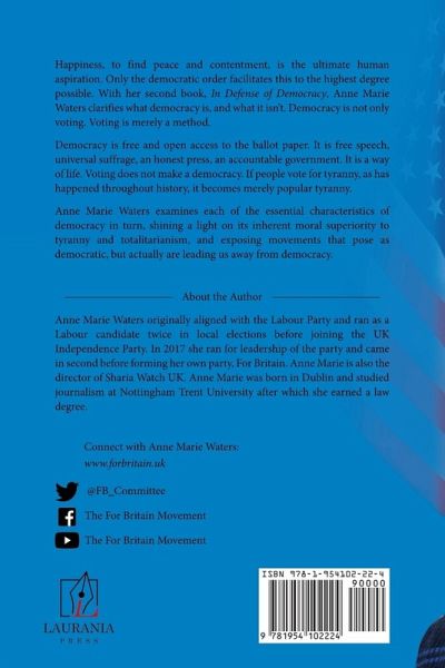 The ultimate goal of human beings in life is to be happy. To find peace and contentment. Only the democratic order facilitates this to the highest degree possible. In In Defense of Democracy Anne Marie Waters clarifies what democracy is, and what it isn't. Democracy is not voting. Voting is merely a method, it is not democracy itself. Democracy is free and open access to the ballot paper. It is free speech, universal suffrage, an honest press, an accountable government. It is a way of life. Voting does not make a democracy. If people vote for tyranny, as as has happened throughout history, it…mehr