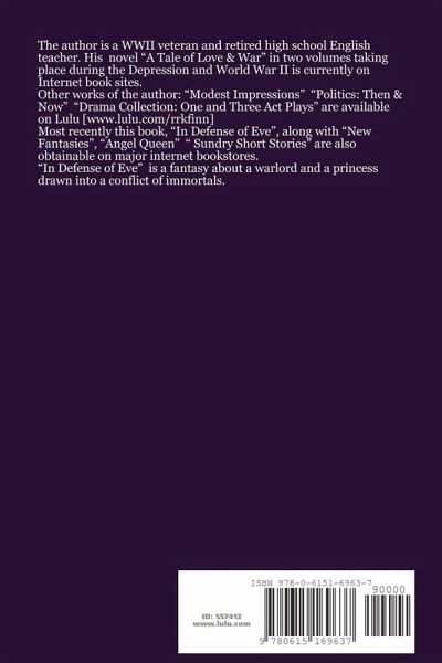 A Tale of Yore: a fantasy about a warlord and a princess drawn into a war between immortals over a kingdom and a queendom. A story for all ages fourteen and over. *** The author is a WWII veteran and retired high school English teacher. His novel "A Tale of Love & War" in two volumes taking place during the Depression and World War II is currently on Internet book sites. Other works of the author: "Modest Impressions" "Politics: Then & Now" "Drama Collection: One and Three Act Plays" are also available on another site:[www.lulu.com/rrkfinn] Most recently this book, "In Defense of Eve", along with "New Fantasies", "Angel Queen" " Sundry Short Stories" are also obtainable on this major internet bookstore.