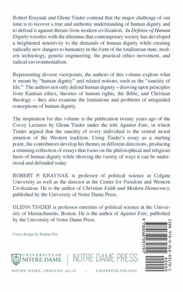 Robert Kraynak and Glenn Tinder contend that the major challenge of our time is to recover a true and authentic understanding of human dignity and to defend it against threats from modern civilization. In Defense of Human Dignity wrestles with the dilemma that contemporary society has developed a heightened sensitivity to the demands of human dignity while creating radically new dangers to humanity in the form of the totalitarian state, modern technology, genetic engineering, the practical ethics movement, and radical environmentalism. Representing diverse viewpoints, the authors of this volume explore what is meant by "human dignity" and related notions, such as the "sanctity of life." The authors not only defend human dignity - drawing upon principles from Kantian ethics, theories of human rights, the Bible, and Christianity theology - they also examine the limitations and problems of misguided conceptions of human dignity. The inspiration for this volume is the publication twenty years ago of the Covey Lectures by Glenn Tinder under the title Against Fate, in which Tinder argued that the sanctity of every individual is the central moral intuition of the Western tradition. Using Tinder's essay as a starting point, the contributors develop his themes in different directions, producing a stunning collection of essays that focus on the philosophical and religious basis of human dignity while showing the variety of ways it can be understood and defended today.