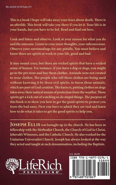 This is a book I hope will take away your fears about death. There is an afterlife. This book will take you there if you let it. Your life is in your hands, but you have to be led. Read and find out how. Look and listen and observe. Look at your reason for what you do and the outcome. Listen to your inner thoughts, your subconscious. Observe your surroundings for any pitfalls. You must believe and know there are spirits at work in your life, good and bad. It may sound crazy, but there are wicked spirits that have a wicked sense of humor. For instance, if you have a dog or dogs, you might go to the pet store and buy them clothes. Animals were not created to wear clothes. The people who sell these clothes are being used without knowing it by these evil spirits, to harm these animals, which are part of God creation. The harm is, putting clothes on dogs takes away their natural means of protection from the weather. These spirits get a kick out of watching us do stupid things. The purpose of this book is to show you how to get the good spirits to protect you from the bad ones. First you have to admit they are real and learn how to do what it takes to get the good spirits to help you.
